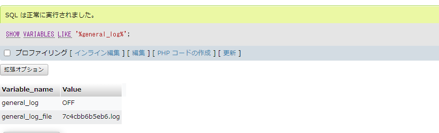 SHOW VARIABLES LIKE '%general_log%'実行結果をみると、状態やファイルの場所が取得されていることが確認できます。
