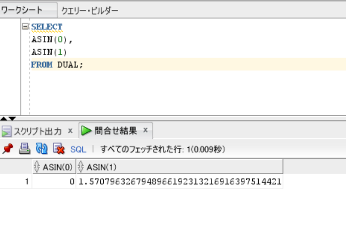 Oracle Databaseで、アークサイン値を取得する手順を記述してます。「ASIN」に対象の値を指定します。ここでは、実際に実行した結果を画像で掲載してます。
