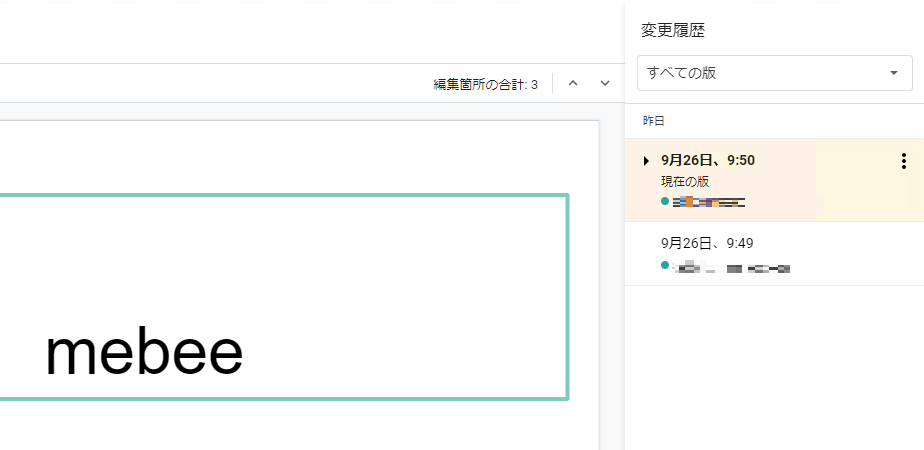 Google スライドで、履歴を開くショートカットキーを掲載してます。「 Ctrl 」+「 Shift 」+「 Alt 」+「 H 」を使用します。ブラウザはchromeを使用しています。