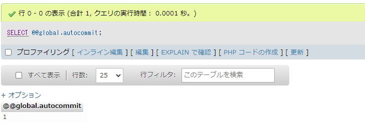 SELECT @@global.autocommit現在の設定が有効であることが確認できます。