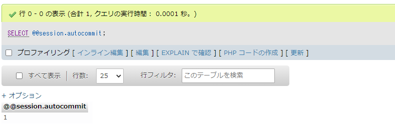 SELECT @@session.autocommit実行結果