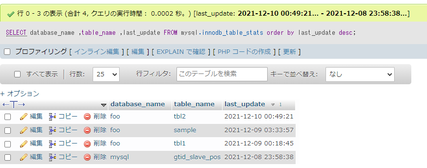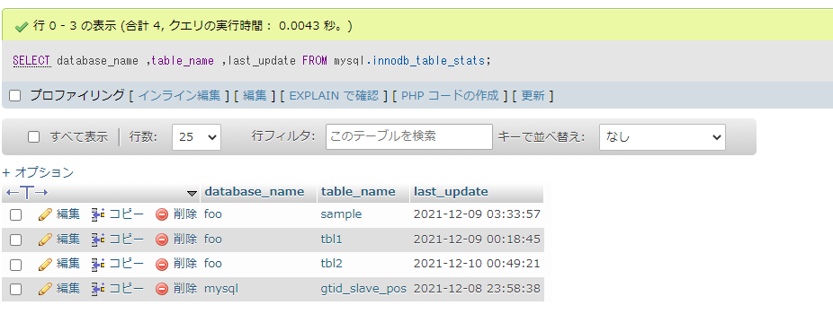 mysql.innodb_table_stats実行結果をみると、更新日時が取得されていることが確認できます。