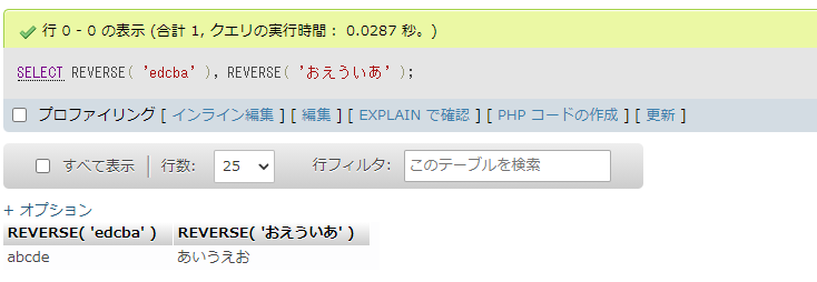 REVERSE( 'おえういあ' )実行結果を確認すると、反転して表示されていることが確認できます。