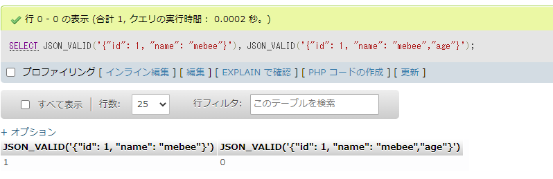 JSON_VALID('{"id": 1, "name": "mebee","age"}')実行結果をみると、確認できていることがわかります。